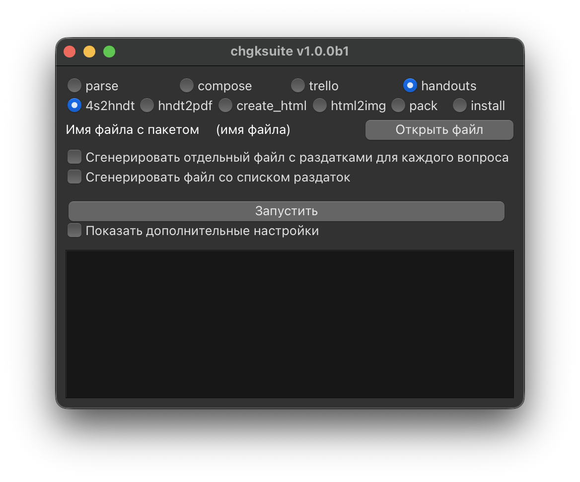 Выберите 4s-файл с пакетом и нажмите «Запустить». В той же папке появится текстовый файл с раздатками. Каждая раздатка, оформленная в 4s-файле в квадратных скобках ([Раздаточный материал: ...]), будет извлечена автоматически.