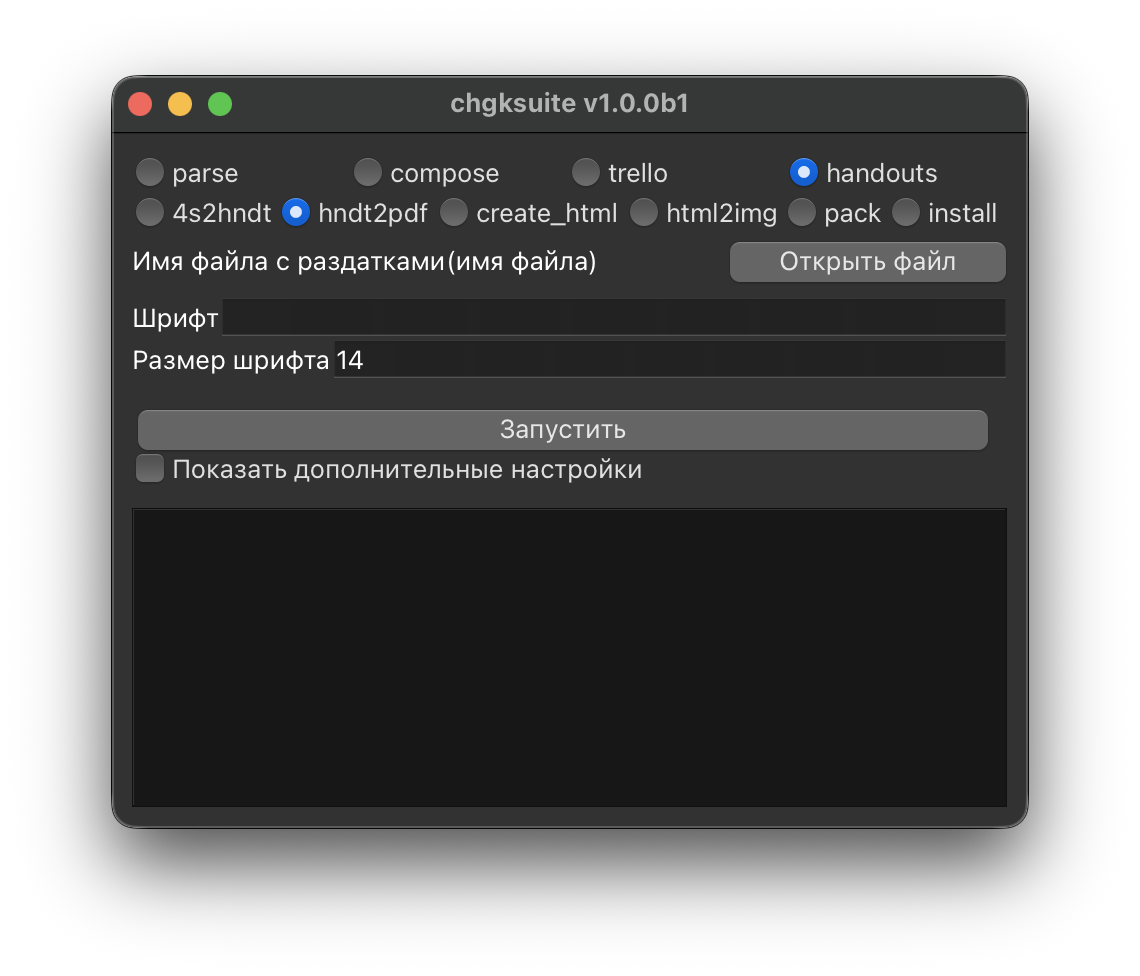 При первом запуске chgksuite автоматически скачает и установит движок Tectonic (компилятор LaTeX), это может занять некоторое время.